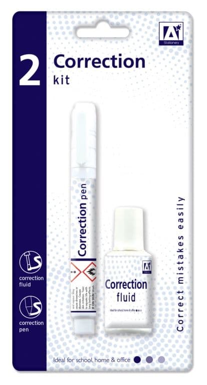 This 2pc Correction Kit contains a 12ml correction fluid with brush for quick corrections and a 5ml squeezy pen with thin metal tip for precise corrections.