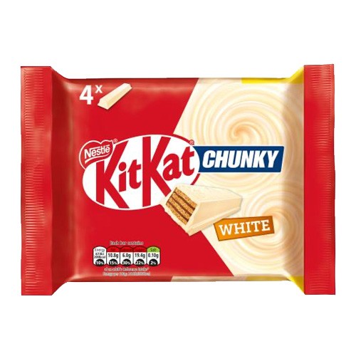 Crispy wafer finger covered with a white coating (68%). KitKat supports improving the lives of cocoa farmers and quality of cocoa through the Nestl Cocoa Plan and by working with the Rainforest Alliance. Learn more: www.nestlecocoaplan.com Rainforest Alliance Certified cocoa. Find out more at ra.org. Join us at facebook.com/kitkatuk Share your break with #MyBreak Check out our YouTube Channel at www.youtube.com/user/kitkat Visit www.kitkat.co.uk Good to remember: enjoying chocolate as part of a varied, balanced diet and a healthy lifestyle, is one of life’s little pleasures. Unwrap, snap off a chunk and enjoy the delicious smooth white coating and crispy wafer of KITKAT Chunky White. With its perfect chocolate to wafer ratio, KITKAT is the perfect companion for any break. You can enjoy KITKAT as the iconic KITKAT 4 Finger, KITKAT Chunky, KITKAT 2 Finger. So, whoever you are and however you break, Have a break, have a KITKAT. Why not mix up your break and try a taste of KITKAT Chunky Caramel Chocolate Bar? Rainforest Alliance – People & Nature, Cocoa Nutritional Compass Reg. Trademark of Socit des Produits Nestl S.A. Multipack of 4 KITKAT Chunky White bars Ideal for a break at home or work Contains no artificial colours, flavours or preservatives Suitable for vegetarians. Pack size: 160G.