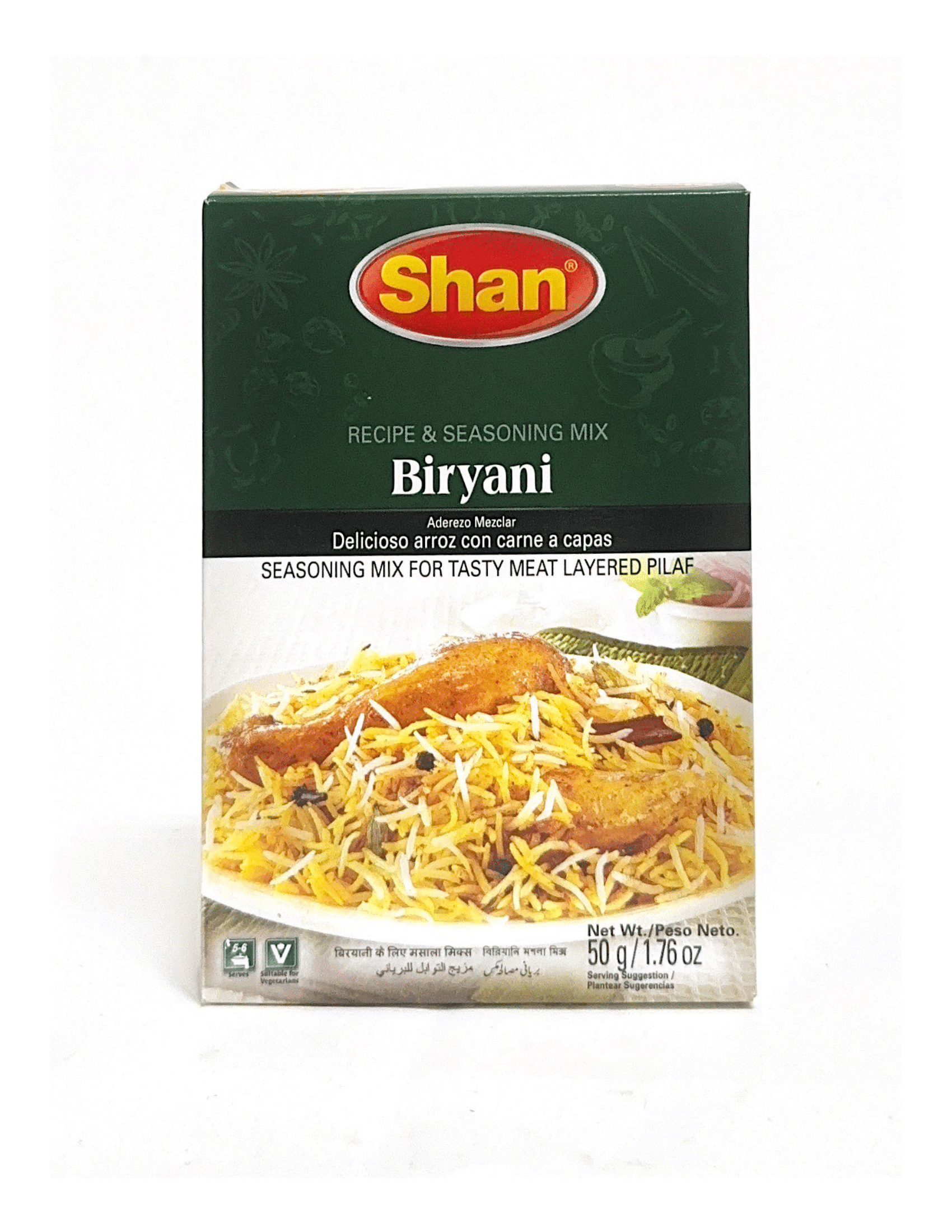Seasoning mix for tasty meat layered pilaf. 5-6 serves. Suitable for vegetarians. Just Perfect. Natural freshness preserved through cryogenic grinding & V-Lock technology. Consumer comments www.shanfoods.com. No preservative. No artificial food color. Product of Pakistan.