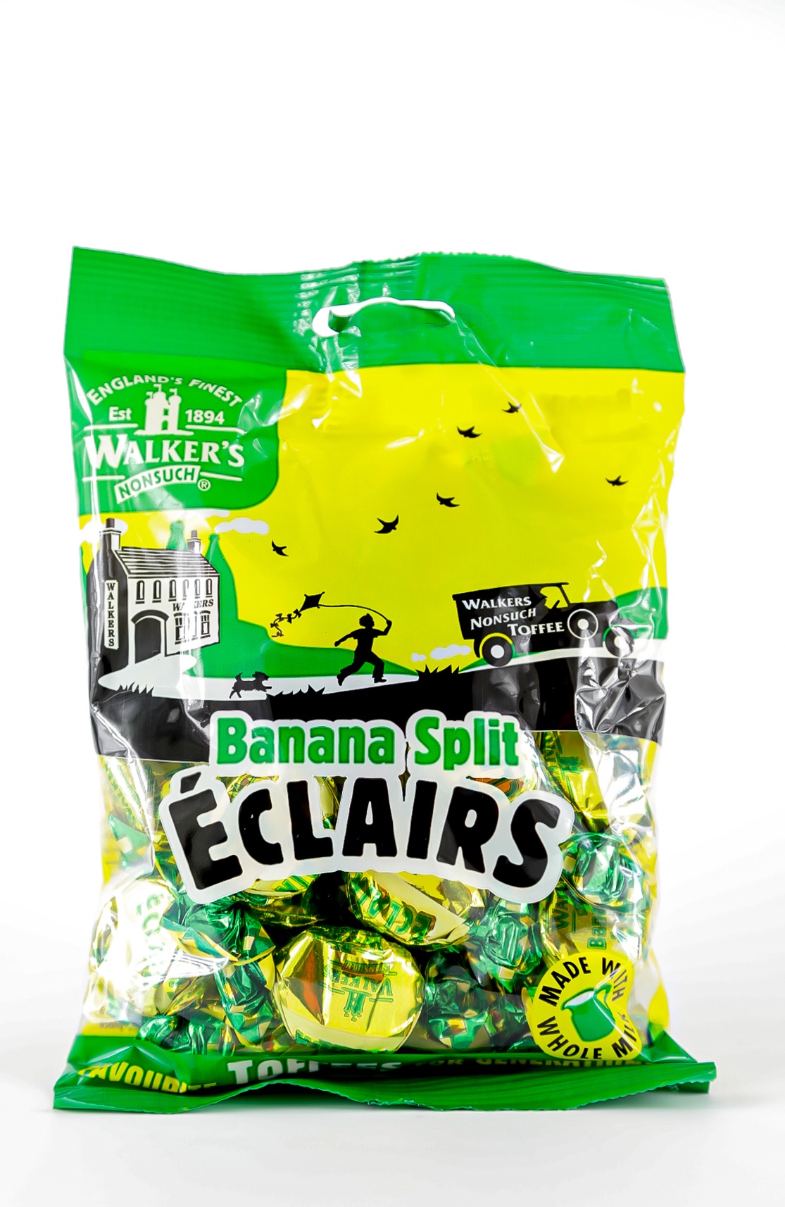 Take a trip down the sweet paths of memory lane with Walkers Nonsuch Banana Split Eclairs. These classic candies bring you a big punch of sweet banana flavour, alongside chocolate and sticky caramel in one amazing taste sensation! Theyre moreish, delicious, and perfect for sharing with friends and family. Give them a try today!