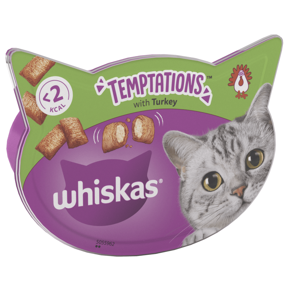 They’ll adore breaking through to the soft, savoury centre wrapped in a crunchy shell. Whiskas Temptations are irresistible treats for your cat, foil packed for freshness and come in a variety of delicious flavours.
